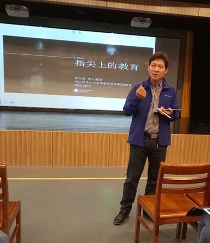 黄教授先为大家带来了“两岸智慧好课堂”比赛的苹果系统教学经典案例,向大家展示了苹果系统为自主、合作和探究式课堂注入的更多可能性:来自江苏的朱老师在课堂上利用VR技术向学生展示了恐龙生活的场景,超现实的写实技术,把远古时期的恐龙带到课堂,激发学生的学习兴趣、开拓了学生的创造力;现场连线常州恐龙园工作人员竞聘小小解说员,同学们兴奋不已,踊跃举手……