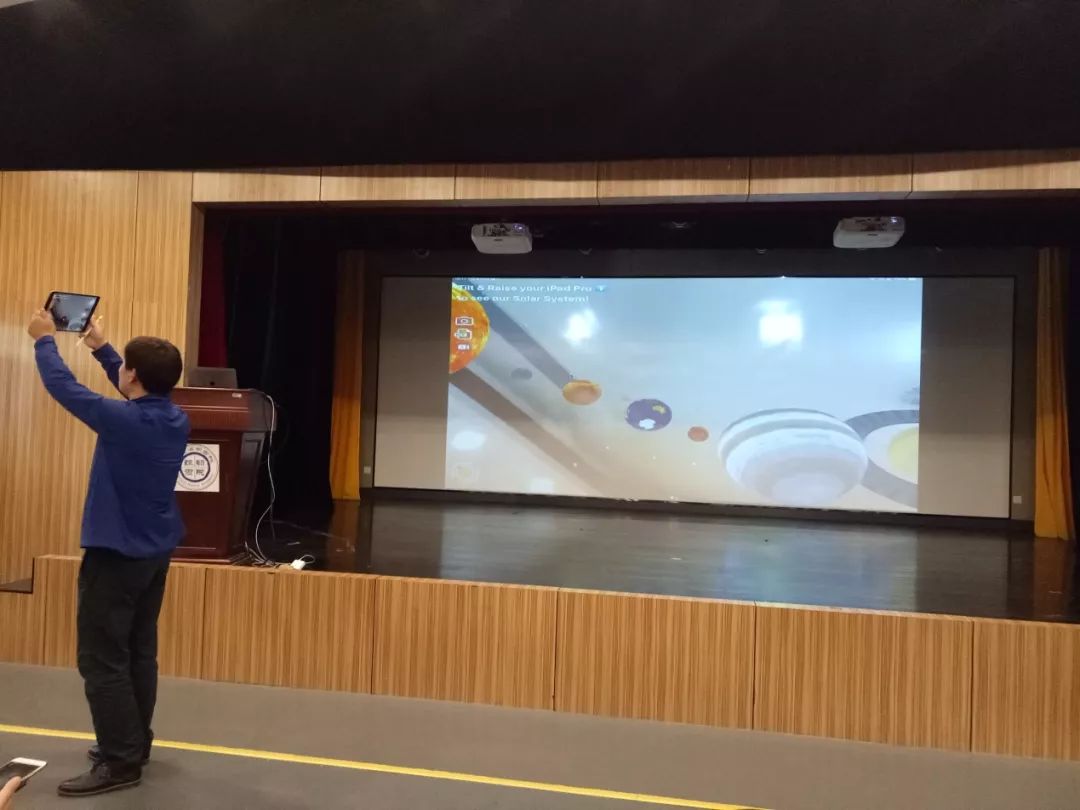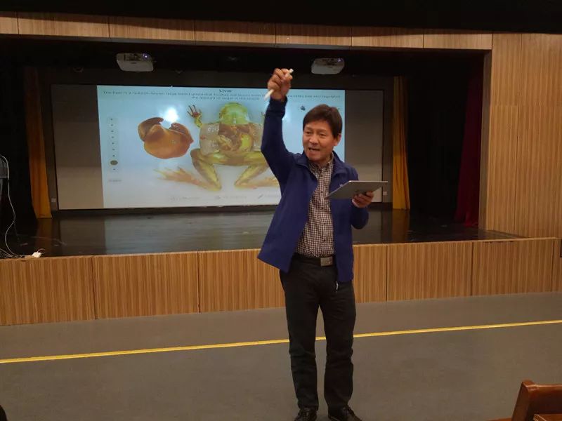 苹果系统搭乘相应的软件,创造出的惊喜让各位老师大开眼界:利用软件,青蛙“蹦”到课堂书桌,短时间内呈现其从胚胎到成熟的过程,甚至可以“不流血”地解剖青蛙;找一块平地,便能带学生们进入设备齐全的实验室;平板向上拍摄,便可以把宇宙投射到教室屋顶……黄教授毫无保留地为老师们展示了多年来钻研、保留下来的软件,生物、美术、语文、数学、化学、物理、英语,按照学科逐个为大家介绍,并教授大家如何发现好用的软件。